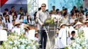 Sementara itu, di tepi panggung, pelajar dari berbagai SD dan SMP se-Kota Makassar menampilkan aubade. Mereka menyanyikan lagu-lagu daerah dan lagu nasional dengan penuh semangat.