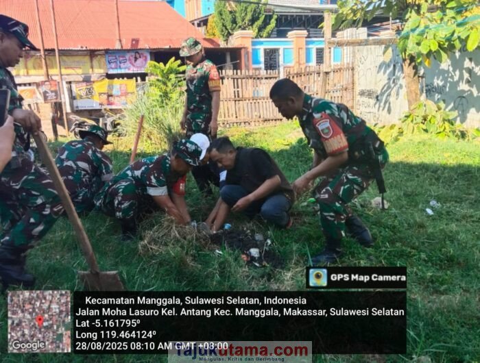 Tajukutama, Makassar – Koramil 1408-10/Panakkukang-Manggala menggelar kegiatan Karya Bakti Penanaman Pohon bersama masyarakat di Jalan Moha Lasuloro, Kelurahan Antang, Kecamatan Manggala, Kota Makassar, Kamis (28/8/2025). Kegiatan ini dilaksanakan dalam rangka menghadapi pemanasan global sekaligus menyambut musim penghujan, dengan tujuan menjaga keseimbangan lingkungan dan memperkuat daya serap air tanah.