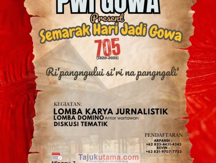 GOWA, Tajukutama.com – Persatuan Wartawan Indonesia (PWI) Kabupaten Gowa akan menggelar serangkaian kegiatan bertajuk “Semarak Hari Jadi Gowa ke-705” pada Minggu, 7 Desember 2025, mulai pukul 09.00 WITA di Sekretariat PWI Gowa, Kompleks GOR Bulutangkis.