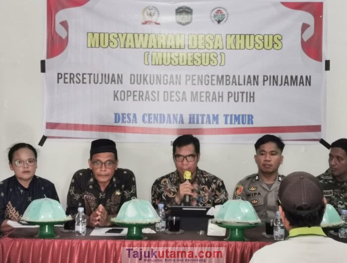 TOMONI TIMUR – Pemerintah Desa Cendana Hitam Timur, Kecamatan Tomoni Timur, menggelar Musyawarah Desa Khusus (Musdesus) untuk membahas persetujuan dukungan pengembalian pinjaman bagi Koperasi Desa Merah Putih (KDMP), Kamis (20/11/2025), di kantor desa setempat.