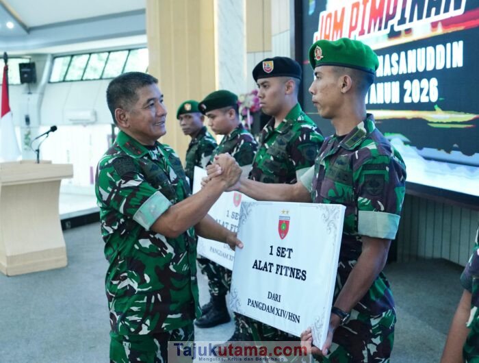 Tajukutama, Makassar — Mengawali tahun 2026, Pangdam XIV/Hasanuddin Mayjen TNI Bangun Nawoko memberikan Jam Pimpinan kepada seluruh prajurit dan PNS di lingkungan Makodam XIV/Hasanuddin sebagai upaya memberikan motivasi serta memperkuat semangat pengabdian agar pelaksanaan tugas kedepan berjalan semakin optimal, dan profesional, yang dilaksanakan di Balai Pertemuan Hasanuddin (BPH), Jl. Urip Sumoharjo, Kota Makassar. Jumat (2/1/2026).
