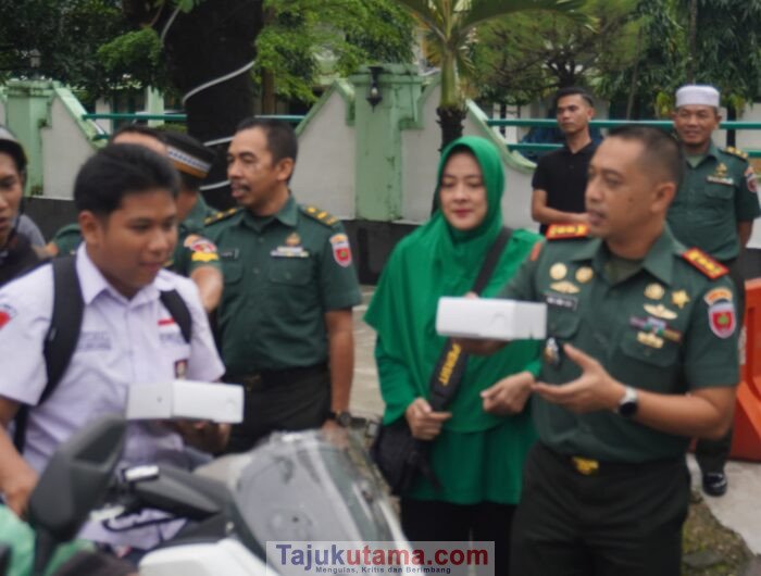Tajukutama, MAKASSAR – Komandan Kodim (Dandim) 1408/Makassar Letkol Kav Ino Dwi Setyo Darmawan, SE, M.Tr.Han., didampingi Ketua Persit Kartika Candra Kirana (KCK) Cabang XI Kodim 1408/Makassar Ny. Ayu Ino Dwi, memimpin langsung kegiatan berbagi takjil kepada masyarakat di depan Makodim, Jalan Lanto Dg. Pasewang, Kecamatan Mamajang, Makassar, Selasa (24/2/2026). Kegiatan tersebut dilaksanakan dalam rangka menyemarakkan Ramadan 1447 H sekaligus mempererat hubungan TNI dengan masyarakat.