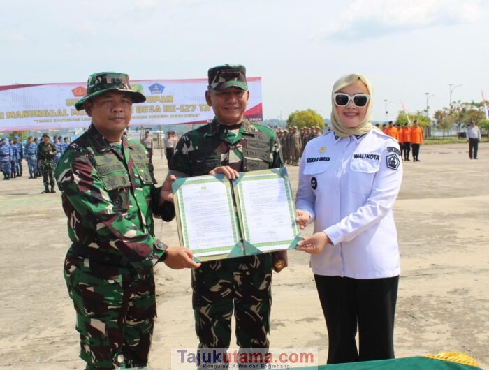 Adapun rangkaian kegiatan yang dilakukan yakni penandatanganan naskah, penyerahan program TMMD ke 127 TA. 2026, penyematan tanda peserta dan penyerahan peralatan kerja.