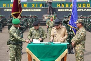Tajukutama, Gowa – Kodam XIV/Hasanuddin menggelar Upacara Pembukaan Pelatihan Dasar Kemiliteran (Latsarmil) Komponen Cadangan (Komcad) ASN Pemerintah Provinsi Sulawesi Selatan tahun 2026. Kegiatan ini dipimpin oleh Kepala Badan Cadangan Nasional (Kabacadnas) RI Letnan Jenderal TNI Gabriel Lema dan dihadiri Gubernur Sulsel Andi Sudirman Sulaiman, S.T., Pangdam XIV/Hasanuddin Mayjen TNI Bangun Nawoko, serta unsur Forkopimda Sulsel, yang berlangsung di Lapangan Sapta Marga, Rindam XIV/Hsn, Jl. Malino, Pakatto, Kab. Gowa. Senin (30/3/2026).